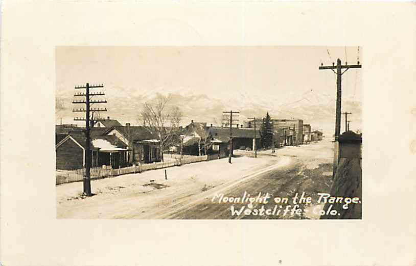 A telephone openwire telephone lead extended along the left side of this Colorado village's main road with lines for electric lighting service on the right. Given the original "moonlight" caption with this picture, those purple glass insulators (as well as others) native to the Denver, Colorado glass works manufacture must have looked purrty nice with the bright full moon glowing behind them ;-) |