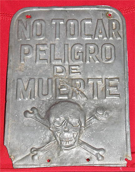 Here's an authentic, original Don't Touch, Danger of Death aluminum sign from Spain. These were used on power poles. Measures 6 inches tall by 4 inches wide. Has some damage to the bottom corners. All holes are original, First email gets this cool sign to add to your mancave for only $55 plus shipping. Thanks! |