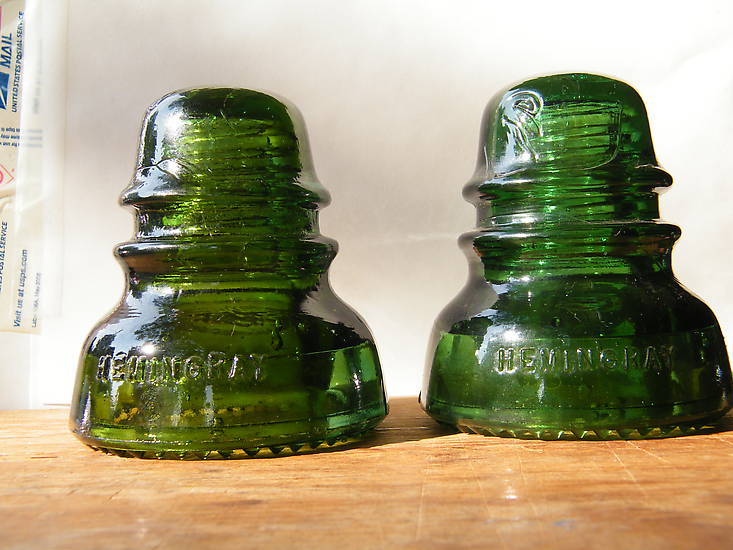 Both insulators are embossed HEMNGRAY on front skirt and No 40 on the rear. Left insulator is the two tone piece. It is olive green on left side and yellow green on the right. A really pretty and cool looking insulator even if it has drip point issues. I count five of those flaked located on left left side or rear. Being they are flaked on the inward side they hardly at all effect how the piece displays. $45 shipped. $52.50 to Canada. Sold $45 Shipped eBay. Right insulator is yellow green/ dark yellow green. It is mint. $35 shipped in lower 48 States and $42.50 to Canada Take the pair for $70 shipped in lower 48. Just add cost of each to Canada above and that will be the total cost if you are from there. Will ship seperate first class otherwise if shipped together the wieght would require priority mail international which would be much more then if the were shipped seperately. |