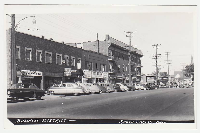 A high voltage, three-phase, double-circuit electric transmission line built with what looks like multipart porcelain insulators was strung above local electric distribution lines upon numerous crossarms that served customers in this Ohio business district's vicinity. |