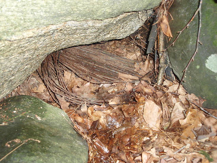 Long, steep narrow gutter filled with coils of iron wire and at least one pole. Did not have time to dig.