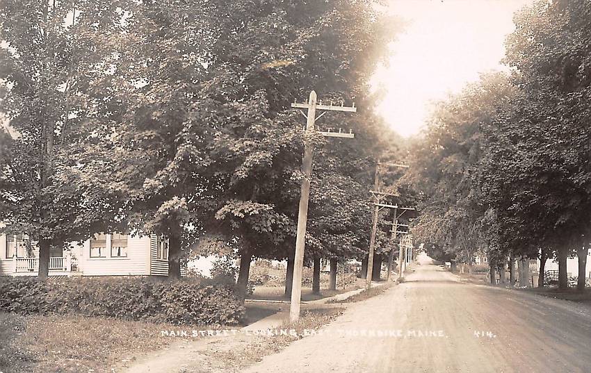 A bit of nice telephone openwire architecture is visible here with "alley-arm" or extended crossarms that appear somewhat (cut) shorter than typical. These supported subscriber wires through this Maine community. In the distance is a taller line on separate poles that might have been for electric lighting customers. |