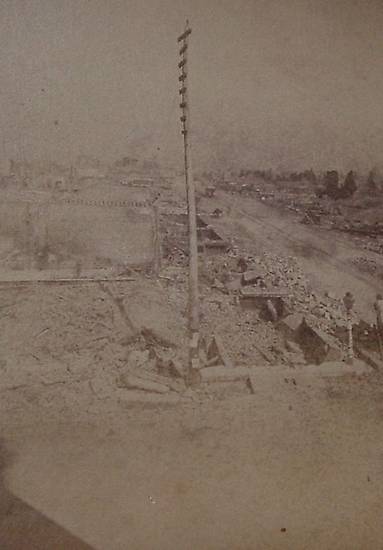 I believe this pole along with many others with a lot of telegraph wires (a Chicago main line) of the c.1870 period were supported by under-crossarm "ramshorn" insulators as they led into the city's business districts. The crossarms upon these poles for some unknown reason were of a descending length as they led down from their poletops. |