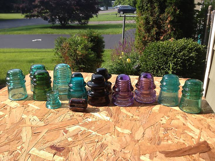 All these insulators were purchased on my Forth of July from a lineman that lives just outside Hartford Conn.. As you may imagine my remorse let up some for not being able to make the Sandwich National this weekend. I am actually quite overwhelmed with the contents I returned home with from this hunt which started by my ever searching of Craigslist listings. The seller only had one of the BMGCO purple CD 134's pictured in the ad. I call to confirm at least that one was still with the 28 piece collection. I was told there was actually two purples due to the wife finding another and added it to the bunch. The pic was awful bad and dark so I still wasn't sure if one of the CD 121's you see was maybe a WGMCo. Boy was I pleased I was mistaken when I saw there was a second 134 not pictured. Actually I couldn't even see the embossing on the one I did know was purple or which CD number it was being shot down at an angle. Obviously once I saw the two of them on the top layer in the box I knew my over two hour journey was well worth it (read on there is more) especially being I stuck out at the flea market which was located half way between home and point B. Also much to my surprise there were two Brookfield CD 121's with blotouts on the rear skirts that will fit into my specialty collection of them very well. They are pictured on the right side of my pic. Both are different color wise then any I had (and I have many). One is a light blue with fizz throughout. The other is a light minty green color. It has lots and lots of snow. I've been keeping my eyes open for a very long time for a snowy piece. I can tell you for sure they are very, very rare. In fact I was starting to wonder if there was such an animal. And I'm not just talking about a few piece of broken off fire bricks her. To end the long post I most add the I may have found both the smallest glass insulator and the smallest guy wire insulator known to mankind. If anyone knows what that are please provide me with all the info you can about them. That would be much appreciated. Update: Found out the little glass piece is a CD 1095 spool and the small guy wire strain are made even smaller. They most me used on model train displays! |