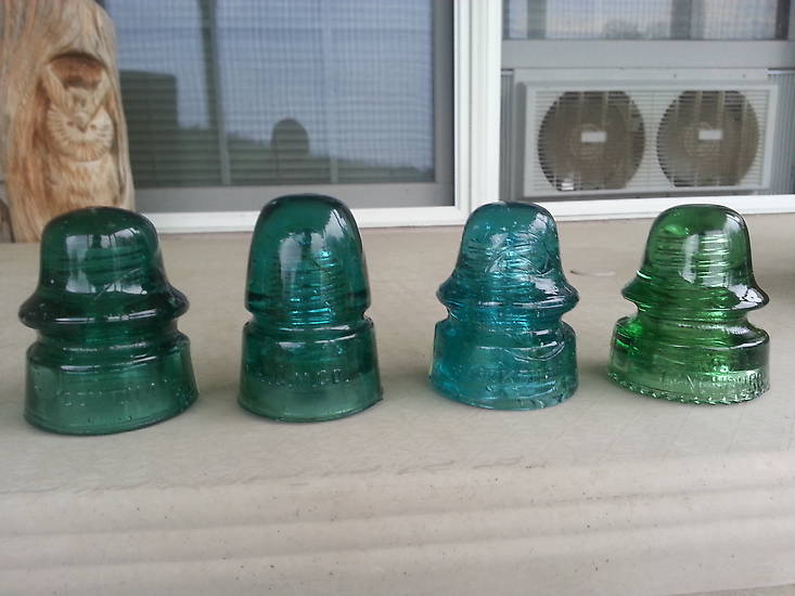 Continuing with my weekend finds, a pretty Brookfield signal in maybe an emerald green with rocks bubbles and an amber wisp, a NEGM beehive with a good sized bubble in the back, amber wisps, and extra glass rim around the bottom of the skirt, snowy blue Brookfield signal, and glowing yellow green Lynchburg signal. |