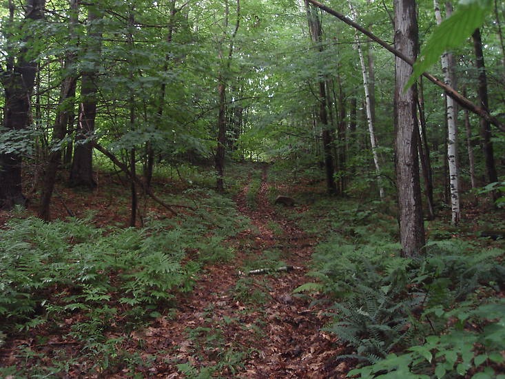 An old lineman's road. These zig-zag across the rough terrain as close as they can to the poles. Many places are too rough for vehicles however and would have require a hike. This wooded stretch of line is 3/4 of a mile long with at least two dozen pole sites. Some of the poles were spaced very close together for no apparent reason. Leaf litter and new soil is deep so meticulous probing and luck will be necessary to find most of the glass. |