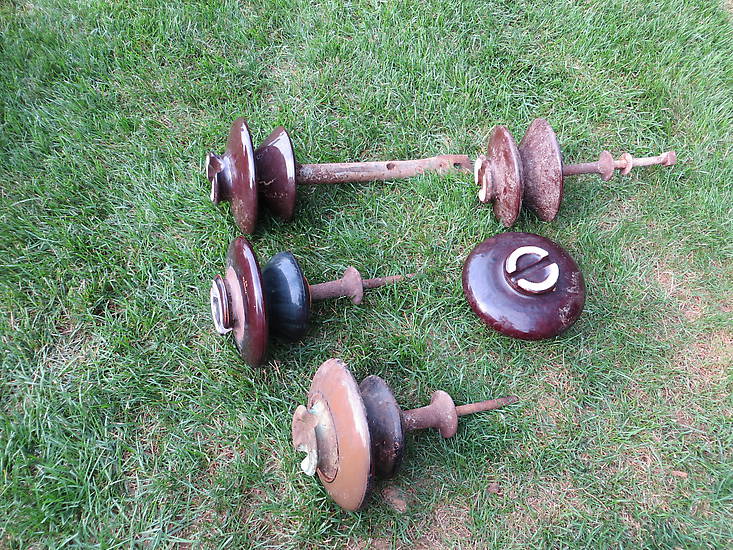Here is the big mud I brought back this time. That maroon OB M-2751 has a slightly different wire groove than all the others I brought back. The brown one on the tubular pin is an old Line Materials piece i believe from the Macomb IL plant. It is marked with an Illinois embossing. |