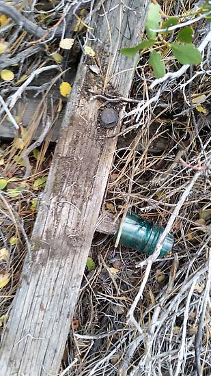 It was cool to find an original 6-pin crossarm and pole from the Transcontinental Tel line (Truckee, Cal). The arm was held with two lag bolts (one is missing), and the glass is a broken CD 141 cross-top, one of the standard insulators used on this mountain section of line. |
