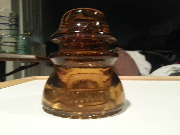 Have a great piece here, VVVNM condition Dominion-42 in an orangey amber color with drip points on base. Embossed with Diamond D logo on front and "DOMINION-42" on back
