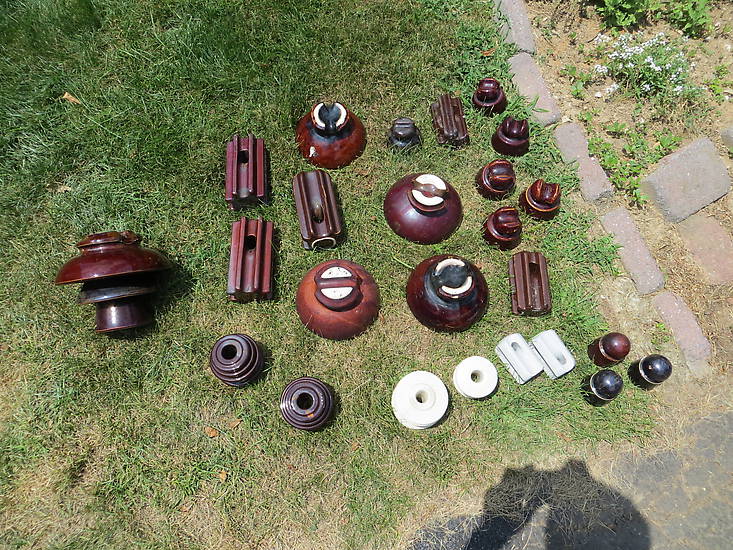 Here is a small collection I got off craigslist today. There are some early Ohio Brass and Victor R=00 multiparts, a Locke r=00 U-748, Thomas U-754s, Pinco U-473s, Locke, Line Materials and Westinghouse johnyballs and some neat spools.