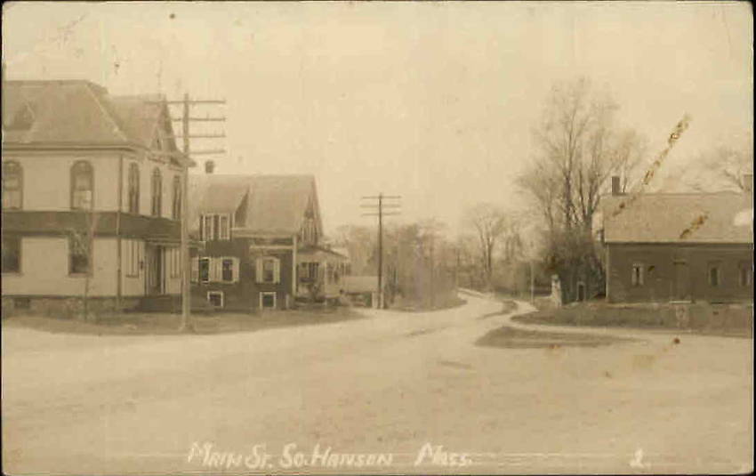 This photo was taken right about where a main railroad line from Boston crossed the road. These openwire circuits led to the New England Telephone & Telegraph Company's office in the Bryantville section of Hanson. The latter was about two miles to the east; this line pararelled what is now known as MA SR 27 or Main Street in Hanson. |