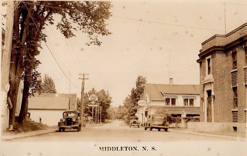 Middleton, Nova Scotia, Canada c1945 Old Cars, Signs, Electric Service Lines