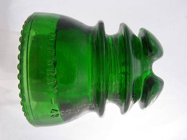 CD 214 [010] (front skirt) HEMINGRAY-43 (rear skirt) MADE IN U.S.A., round drip points, there is a flashover on the front skirt that cuts across "43" and has scarred the glass and a tiny ping on the inside edge of the inner skirt. These book for $75-100. I bought a piece in Dwayne's auction so am selling this to pay for what I bought so am offering a deal at $70 plus postage. |