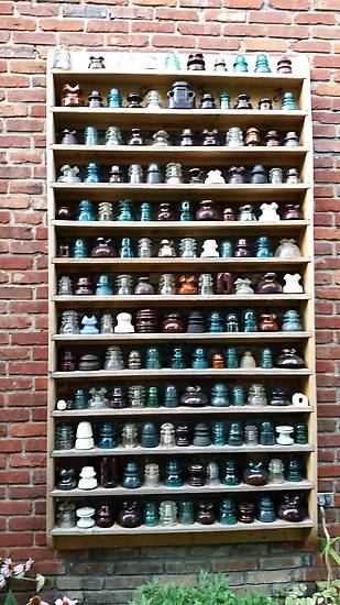 Someone answered my insulators wanted ad. After I looked at the ones he wanted to sell, he showed me this display. Nothing really unusual, but some nicer pieces. Sadly, he wouldn't sell any of these. I would have given him more for one blue Pittsburg High Voltage than I gave him for all the more common ones I bought. Sorry the picture is blurry, it was getting dark. |