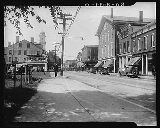 Lower upon this pole line may have been fire alarm telegraph circuits (lowest crossarm). A radial wave incandescent street light on a mast arm with adjacent lead-sheathed telephone cables also were strung along this route in this New Jersey community 80 years ago.. |