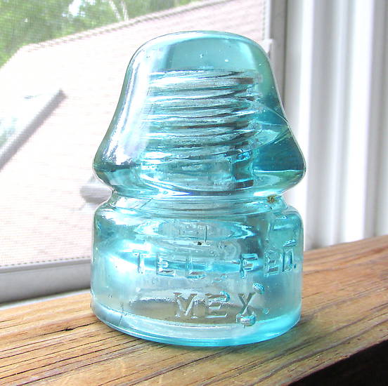 CD 133.1 Tel Fed Mex in aqua. Overall the piece is in excellent condition. There is a ¼ of an inch open bubble on the base, several areas of moderate scratching and scuffing on the skirt and wire groove, and several small pencil point and pin head sized exterior dings. $85 plus shipping. |