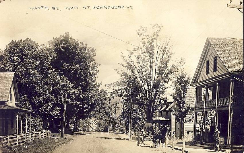 The latter extended along the left side of this quiet dusty road in rural Vermont. Electric lighting service poles and wires were strung on the opposite side of the street (on the right). The end section of an electric distribution crossarm is peeking out from the upper right corner of this image ;-) |