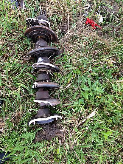 This string of 7 suspension insulators was found below the tower, tossed from the top after it was apparently blown apart from a lightning induced power arc/ flashover. The porcelain was cracked and had molten metal fused into it and the metal parts around the conductor and top insulator was severely melted and pitted. |