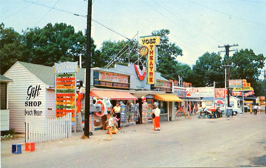 This community is on the mainland side of the Cape Cod Canal which has two bridges that lead to Cape Cod. The electric utility serving this community (as well as neighboring ones and all of the Cape) at the time was the Cape and Vineyard Electric Company. Here we see a festive street scene typical of the magical fun 1950s with plenty of activity and colorful signs, storefronts, etc., abound ;-) |