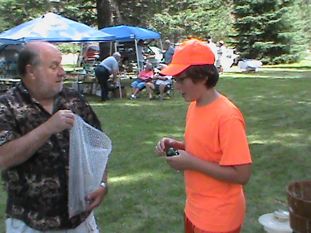 Tim Wood's was giving miniature insulators away to kids at the show. Here he is giving Travis a mini.