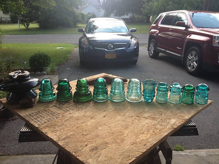 As I was weighed down walking back to my parked car I was reminded of simular hot humid day at Parris Island S.C. going through Marine basic training. My backpack was very heavy on that trake back to the comfort of aircondition awaiting me. I'm just glad their was nobody to my rear pulling on my entrenching tool trying to keep up with everyone force marching ahead. As to the insulator shown there are a few one doesn't find everyday. The upside Hemi No.16 has a nice bubble. Also shown are a couple tough to find CD 106's. one is a NN No.9 and the other a snowy patented Hemi No9 with a shot of green amber on the front side. I guess most of you collectors know what all the rest of this batch are. I'll end this post telling you that I found my very first Lynchburg CD 162 signal with a smoothe base. It is a green aqua color. |