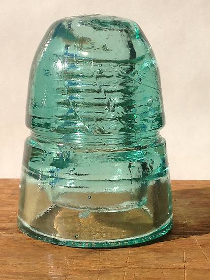 This is the flat dome version. I'm not sure all 030 embossings have the flat tops but they all have the JAN 29 1884 patent as this one does. From what I gather that is an error. This piece is on the crude side and has nice skirt bullbles on one side, some light milk in a couple areas and an oval shapoed underpiured inner skirt. Between the top of the dome and the top of the threads there is basically a big cavity without any glass. That would be something you would have to inspect with your finger if it is long enough. The condition is is mint minus a shallow flake at the bottom of the skirt on one side. The overall size of that scallop shaped flake is less then 1/4". It dies not effect the base embossing at all. It so shallow I didn't even know it was there until I was taking my pics. If you notice a small piece of junk in my pic when zoom in that flake would be at the base of the skirt less the 1/2 inches to the left of that junk. If you need a close up to make a decision to buy just let me know. I've been using my iPhone to make my postings being it is less time consuming. But I will get you a puc with my regular camera and email it to you from my PC. I wiuld just hope this insulatir doesn't get away from you being the older pricess takes me some time getting back. First emailer will have this insulator shipped to their door for $35.00 anywhere in the lower 48 States. I accoept Pay Pal non-fee payments as well as personal and money order checks. |