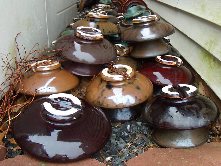 Here is a old picture I found on my computer of the first group of multiparts I found. Got these off craigslist for free back in late 2010. Most of them are Ohio Brass M-2611As from the late teens or early 20s. There are also some 1938 OB M-2613s in there, some of which have the copper radio treatment. This find got me into the bigger power pieces. I had these stacked up at the time because I didn't even have a display yet! |