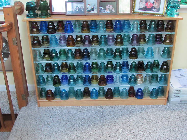For sale is one of my two display cabinets made by Brian. This is the 34 high by 52 wide cabinet with 5 glass shelves (they usually come with 4 shelves) in golden oak. The one in the photo is exactly the same as the one I'm selling...the photo is to show the capacity of the cabinet that can hold as many as 102 signals if you crowd it as I do. THE INSULATORS IN THE PHOTO ARE NOT FOR SALE!! I will be bringing it to Springfield to display my sales pieces and thus it will be available to you delivered to Springfield. I'm asking $600 for it which is below the cost of a new one. It's in very good condition with only a scratch on the top that could easily be fixed up. Contact me privately to discuss and arrange pickup if you are interested. Peter |