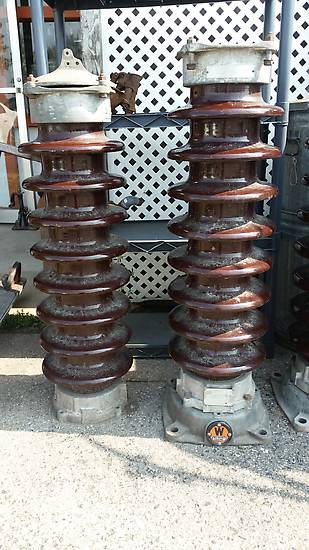 We're vacationing in St. Ignace Michigan this weekend. My husband was horrified when we stopped at an antique store and I found these lightning arrester pieces to add to my Westinghouse collection. That's the great part of driving a hatchback... you can fit 3 foot tall several hundred pound pieces of porcelain in it. He did suggest maybe we could use one for a mailbox post. The owner has a couple more if anyone is interested... |