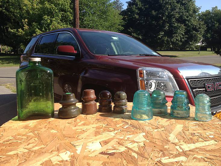 Hemingray bottle on the left say, Water / Made to use with / G.E. Refrigerator on the front. Shaun said it was a pretty tough one to find. Therefore I returned to the antique shop and freed it from the locked cabanet it was in. All the insulators except the Brookfield beehive creb were found at one flea market today. I found the creb following leads yesterday after bombing out at a different flea market. It was in a yard sale. Owner said her father collected it and has many more she couldn't get at. When she digs them out she will call me abd meet me cliser to where I live for a look. |