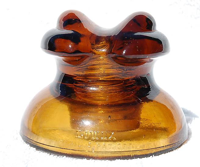 CD 230 HONEY AMBER LOWEX FROG EYES (F-Skirt) LOWEX / REG. U.S. PAT. OFF. ( R-Skirt) 512 / 9 - MADE IN U.S.A. - 0 It has three little aluminum rub spots on the top. Still a great buy at ...$45.00... plus postage. Picture taken outdoors. Buy with confidence! I ship USPS Priority Mail, Payment may be made by Pay- Pal or other forms. ---- WE DO NOT SELL FAKE, PAINTED, STAINED or ALTERED INSULATORS. NO AUCTION TO BID, NO BUYERS PREMIUM TO PAY |