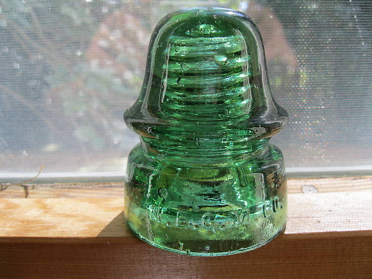 Nice bright green CD 162 N.E.G.M.CO. in bright bubbly green has nice bubble through out glass, one base tiny open bubble and one bb ding rear of crown, a nice insulator . $95.00 shipping paid, PAY-PAL accepted.