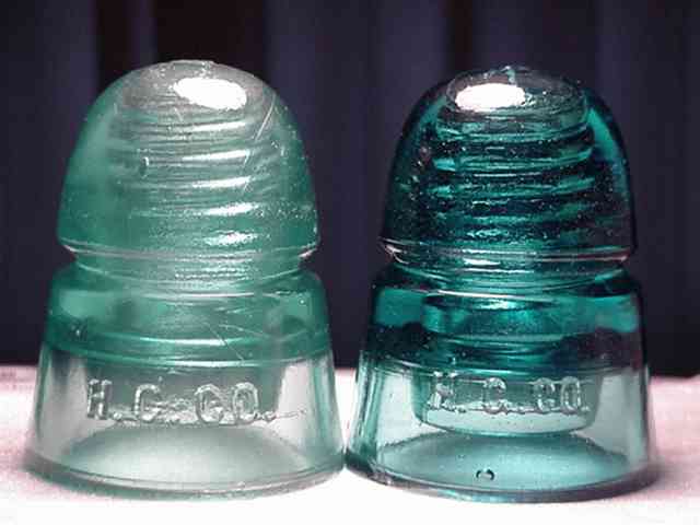 2 CD 145 H.G. Co. beehives of the "non-Petticoat" variety. [020] A light foggy green aqua, and Hemingray blue. Most commonly seen embossing font.