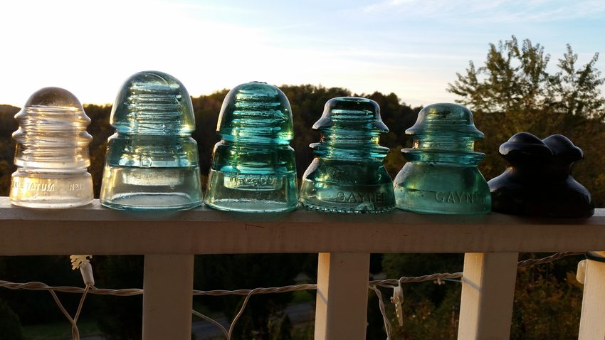 Half from an antique store, half from a response to my ad. Whitall-Tatum CD 113 [030], B beehive with a big B, H.G. CO. beehive with vertical bar blot outs [040], Gayner CD 153 [020], Gayner CD 154 [010], Hemingray CD 230 [090] I think, looks like faint numbers above Hemingray. Also, the Hemingray piece has white patches in the glass that look like crystal clusters, and you can see white specs in the glass if you shine a flashlight into it. |