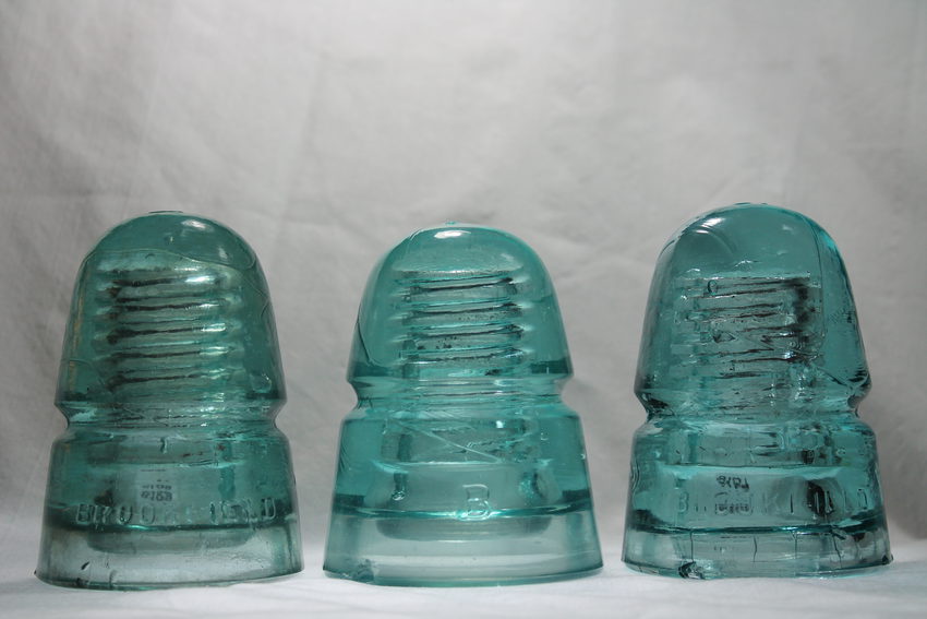 Here are some Brookfield 145's. The first one is a Brookfield/New York, large backwards 6 on crown. I took this one of a pull in Reading. Nice narrow crown with a orange peel textured crown. The middle one is a "B" shorter version with a large backwards 7 on crown. The last one on the far right is a Brookfield/New York with a large backwards 2 and glass dot on crown. This one is very wrinkled throughout and in a nice blue aqua, narrow crown. |