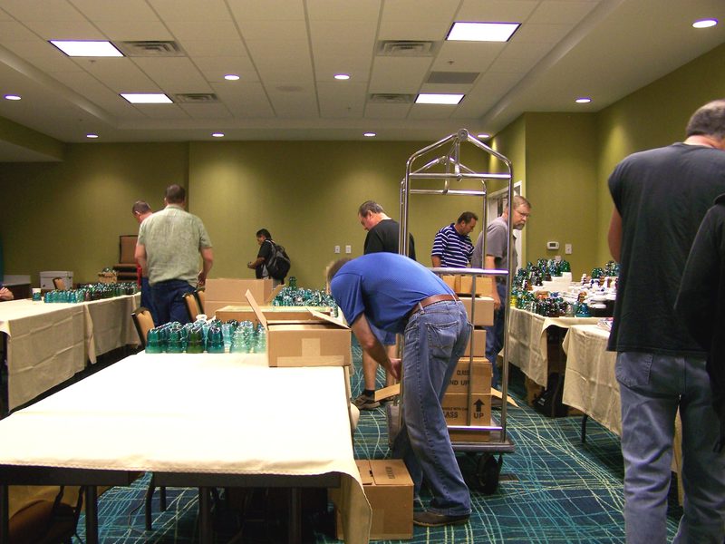The 2015 Garland insulator show was held Saturday Oct 24th at the Springhill Suites by Marriott in Richardson, Texas. The 20 inches of rain that fell Thursday and Friday closed I-45 between Houston and Dallas, and brought I-35 between San Antonio/Austin and Dallas to a crawl. Unfortunately some people that were on their way Friday had to turn around and go home. However, some were able to make it through as you will see in the pictures of some of the tables. Frank Shiels is showing his best side for the camera as he sets up. |