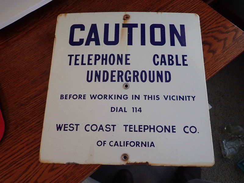 Caution Telephone Cable Underground Before Working in this Vicinity Dial 114 West Coast Telephone Company of California. Some rust at edges a little chipping of porcelain at edges on bottom edge. $40.00 shipped within the continental US. Personal check is fine. Jim White 7990 Windcombe Blvd Indianapolis, Indiana 46240 |