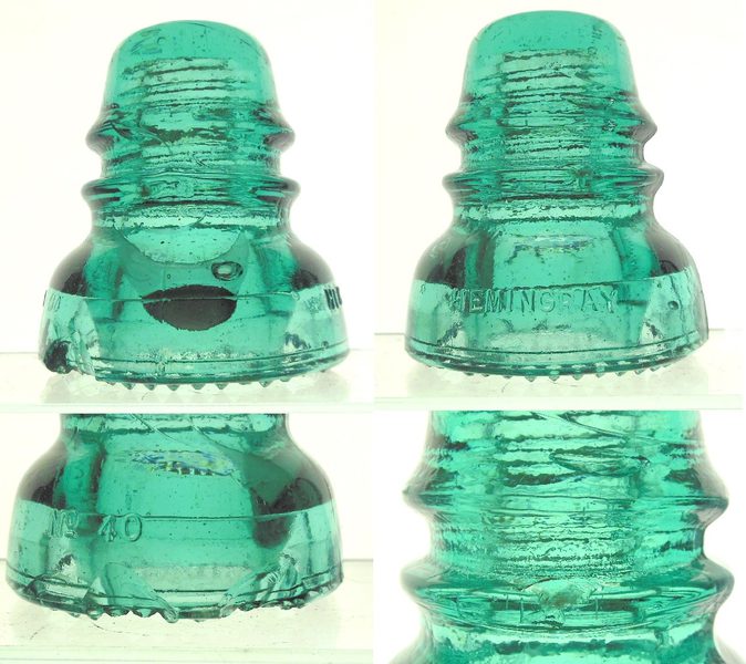 A big thumbnail sized carbon bubble with milky crescent moon cape in this Hemingray No 40. 2 base chips to the LH side and rear of the bubble, a NGM arc bruise from a bumped drip, a small WG lip chip in the front and about half the drips chipped/flaked/halved. It ain't perfect, but this is a rare feature for Hemingray pieces and is a must-have for the Hemingray collector. I have more photos on request. $21 + ship or free delivery at Springfield. |