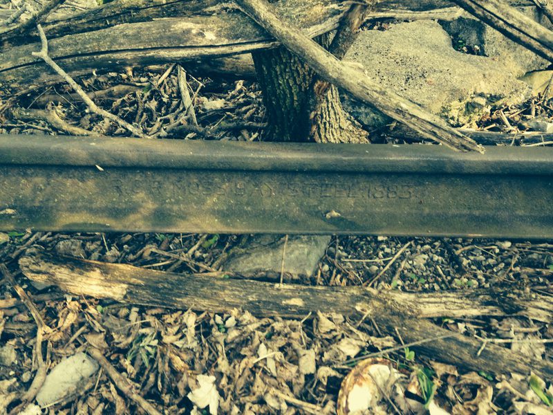 Under the former Canadian Northern bridge in Yarker, Ontario, sits this original Bay of Quinte Railway rail. Built in 1884, this rail was manufactured in 1883.