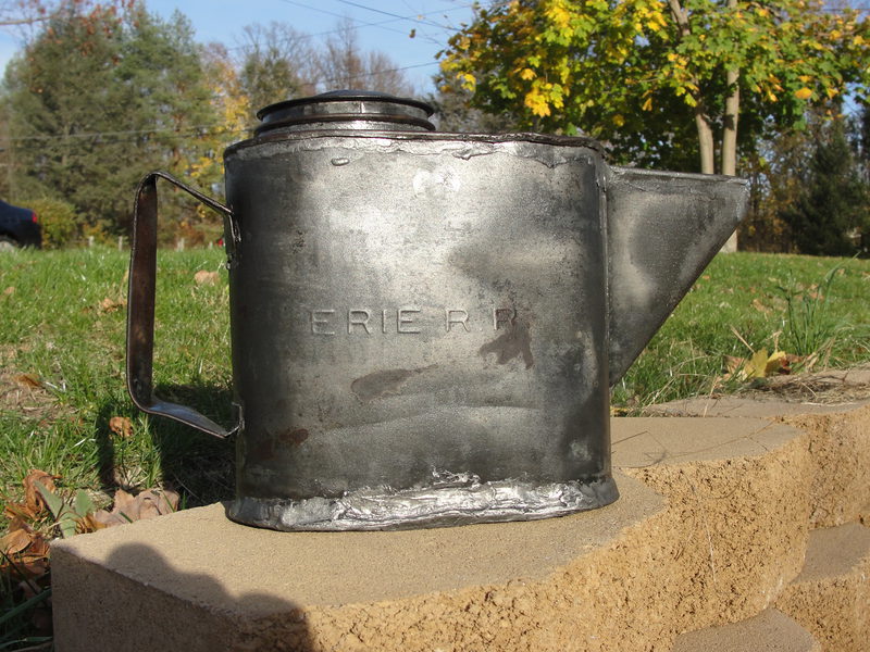 This is a nice example of a hand soldered railroad can. The front has Erie RR stamped on it and it measures 12" wide and 7" tall. Also comes with the original cap. Nice go with for an insulator collection.