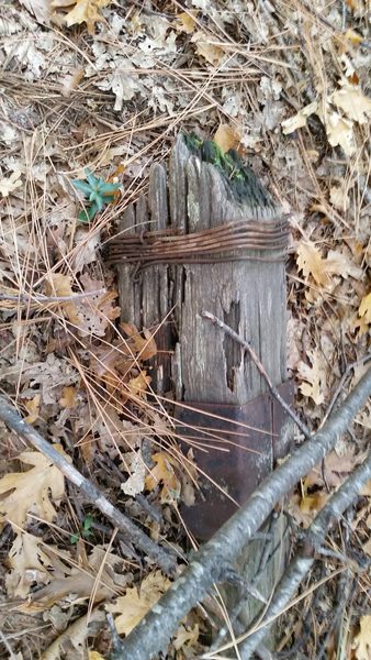 Top of an original 1914 transcontinental line pole, showing wire banding and metal guards for the guy wire that wrapped around the pole.