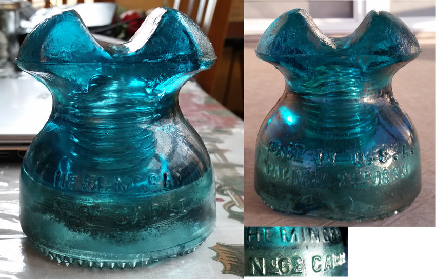 My only insulator this weekend, from a flea market. Hemi Blue CD 252 [220]. I think it's a [220]. All of the embossing on the back is definitely done over blotted out (unreadable) text. Also, as you can see in the picture, the No. 62 appears to be redone over blotted out text, or at a minimum it used to say No. 2, and they squeezed a 6 in before the 2. About half the drip points are gone, but no other damage. Interesting piece. |