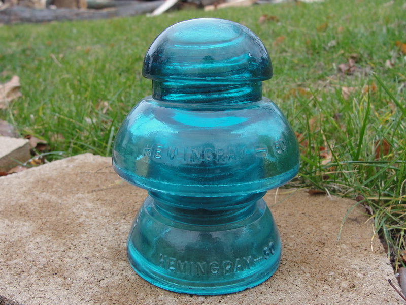 This one is in very good overall condition with just a couple small flea bites on the upper section. The lower section has two small wire groove nibbles and one or two flea bites near the base. Both pieces are embossed Hemingray-50. Asking $17.00 plus shipping. |