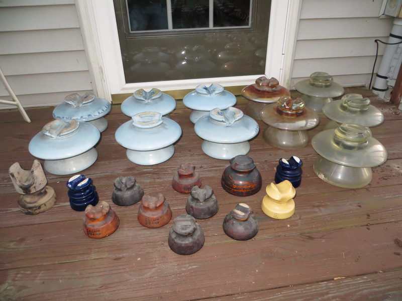 Here is a group of insulators I picked up over the weekend from an add on Craigslist. The larger ones are JD U-872s and Pyrex CD 325s in both clear and carnival. Most of the smaller ones are Lapp U-459s and U-480s within the 1927-34 date range. There is even a Westinghouse composition cabletop in there too. These would have come off of the old Conowingo Power Co system in northeast MD. The U-872s were on the 34.5kv lines coming out of the Conowingo Dam. |