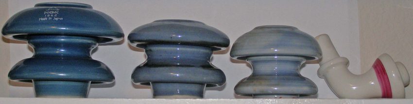 Here are some less common colored porcelain - actual postage additional -- all in good condition Great blue colored spool from Australia -- inkstamped NGK / 1962 / MADE IN JAPAN -- $12 (SOLD) unmarked speckled blue spool from Australia -- $10 light blue unmarked blue spool from Australia -- $8 Very cool wall insulator (designed to insulate a wire through a wall) with a bright red stripe! Likely of European origin and in great condition. -- $15 (SOLD) |