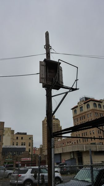 I was literally about to pull out of my parking spot when I turned around and noticed this on a pole behind me! The pole had 3 crossarms on it, and the metal structure in front of it is the remains of a wooden platform with metal railing.