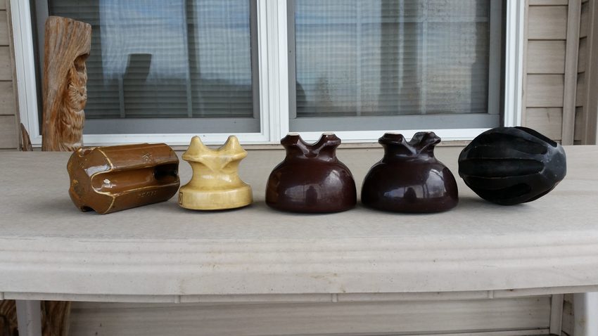 My husband Tod was buying insulators for me at an antique store while I was doing experimental baking (another of my hobbies) with a friend. Another customer struck up a conversation with him mentioning that he had about 4 dozen insulators that he got from an estate sale that he was trying to sell. We went out to see the insulators and bought the lot. Nothing really exciting, but some less common pieces. This and the next 6 photos show the more interesting of the pieces. This photo is of 2 marked Victor U-660A(?) in 2 different shades of brown, a Victor U-625 in a light yellow or fawn tan, perhaps (not sure of the color), a Franklin ESSCo Johhny Ball (left) with the Keystone/Circle mark, and a large unmarked football shaped Johnny Ball. |