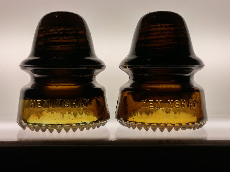 1)For sale the insulator on the left. A great Olive amber with aqua swirls. The pic shows this piece compared to plain Olive amber. The color blending is beautiful and more striking in person. These Olive amber units are harder to come by then the root beers. Damage is contained to the rear skirt, with inner doing to the wire groove. Very nice and at $100 shipped priced well below book. 2)For sale is the unit on the right. Olive amber displays minty. The damage is contained to the rear skirt, no damage to the dome or wire groove. Priced at 75$ shipped to your door. Or take both for $155 shipped More pics upon request. |