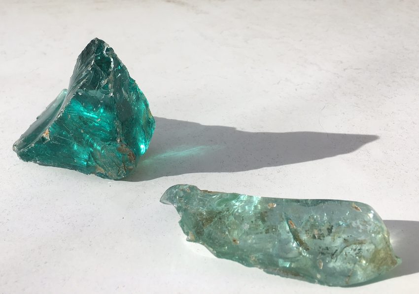 On the left is a very pretty green aqua glass shard (around 4" x 2" in size) and off to the right is a lighter aqua shard of glass. That piece almost resembles a handle to a glass cane which WGMCo did produce. I found some years ago at the site a handle to an ornamental small cane which was the color of a lighter aqua WFGCo toll. There are pics somewhere showing the WGMCo employees with glass canes that they produced at the site and as I recall they were used in parade. WGMCo bottle glass came in many colors....steel bluish, straw, clear and peach. Aqua and deep green aqua colors as well. Indeed some hutch bottles are known marked Elk Mountain Bottling Works Crested Butte Colo which come in that lovely deep greenish color and are marked with the buckle trademark. While insulators were an important item at that plant their main business was bottles--everything from small medicine to food and other utility bottles as well as various sodas, beers and whiskeys. |