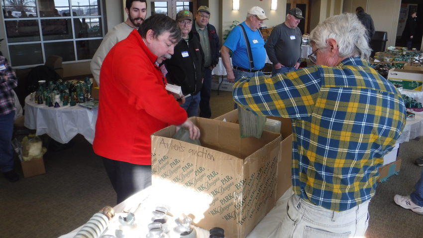Rick & Mike going through the box ready to hold up an auction insulator, I mean glass blocks. Lucky winner gets them for under $10. Greg that is right behind Rick Soller in the Red jacket was this years big winner for the most bought. he had QUITE A TRUCK FULL. He said he plans to make many of the common stuff displayed into his landscaping in his yard. This was one of the high lights of the swap, the auction. along with a wonderful lunch. Courtesy of the greater Chicago Insulator Club and the members. |